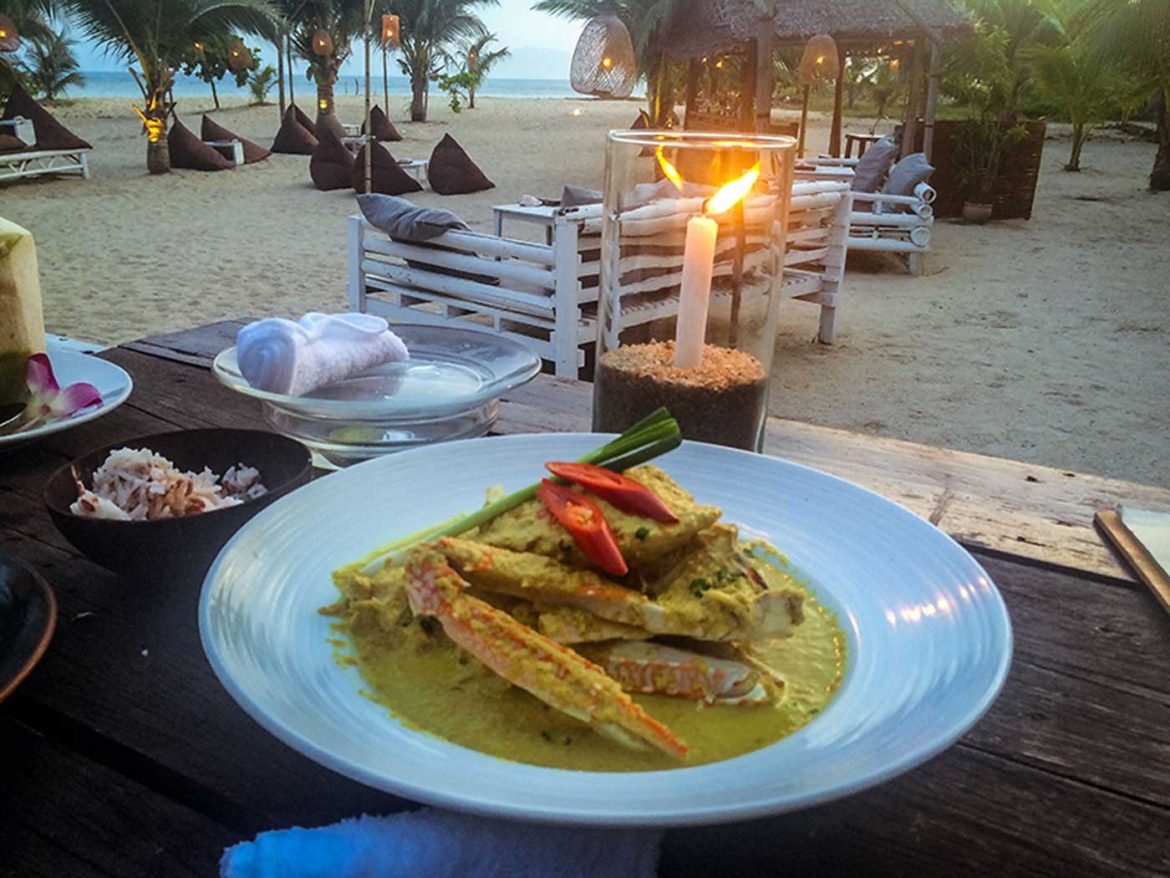 Experimentamos o caranguejo com molho de curry amarelo que é a especialidade do chef e adoramos. Vale comentar que você precisa reservar a mesa na alta temporada e principalmente nas semanas que acontecem a festa da lua cheia.